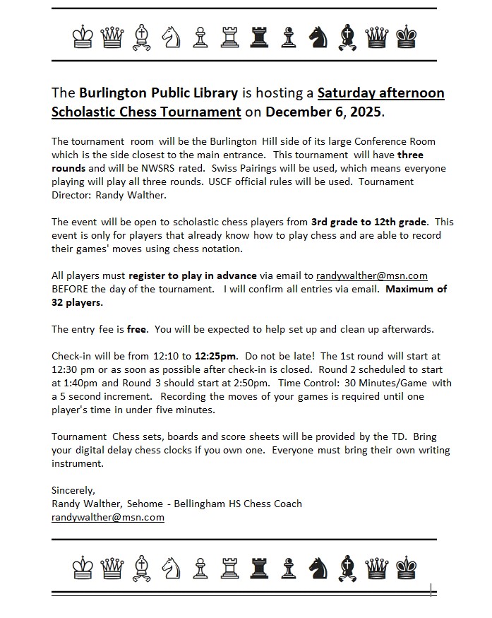 Welcome! This website is a volunteer effort to share information regarding chess playing and learning opportunities for youth in Northwest Washington and beyond. |